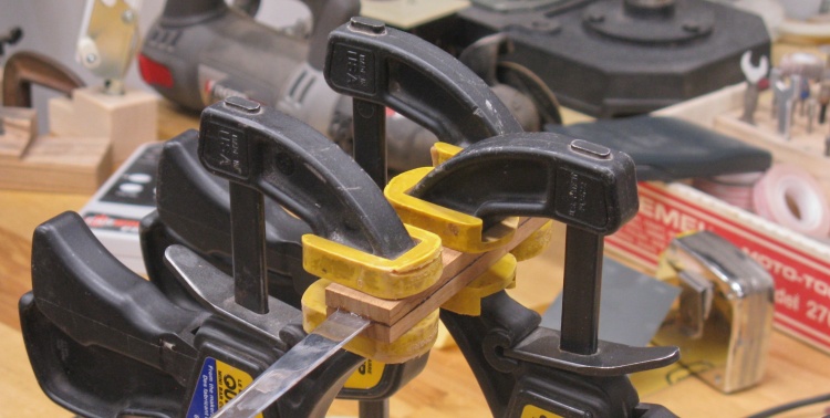 One little strip of veneer, one handle side, some glue and some clamps made the subject of this photo.