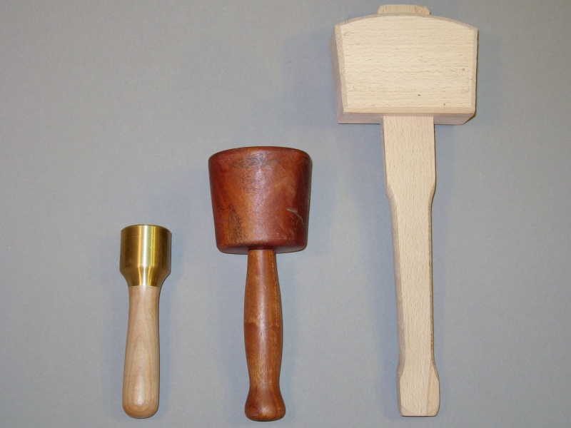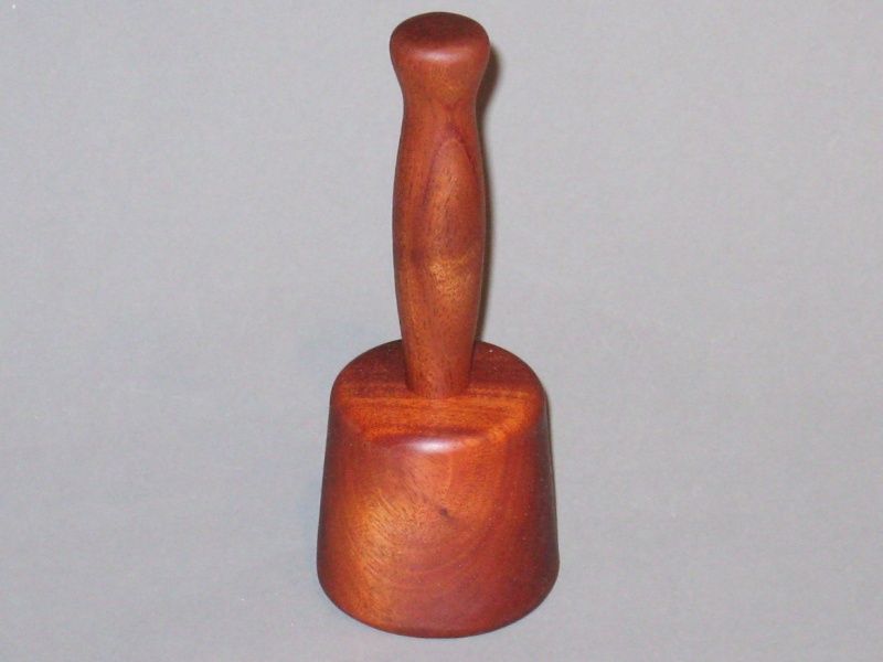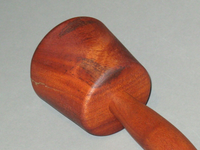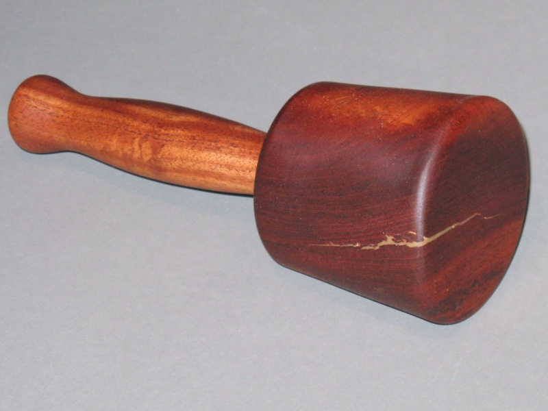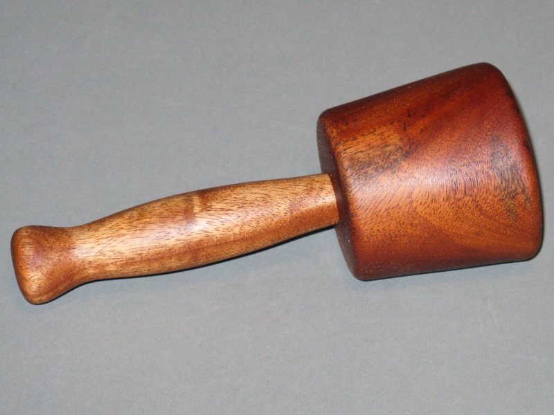 I had an old mahogany bowl blank from many years ago. It was cracked, which I figured would limit the utility of any bowls made from it, but it looked like it might make a fine mallet head. I have a couple of mallets, but in a Goldilocks-ian way, one is usually too big and the other is usually too small. This one would be juuust right. I turned the head and handle separately, and friction-fit them together. The crack in the head was filled using wood glue, with the aid of a vaccuum to help draw the glue deeper into the crack. I like the look of the finished piece, and the mallet is in fact just the right size. Of course, now that I have used it a bit, it is not quite so pristine as it was in these pictures.
