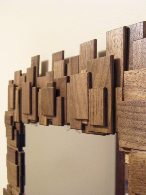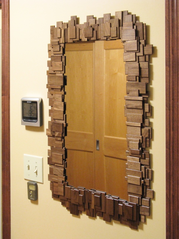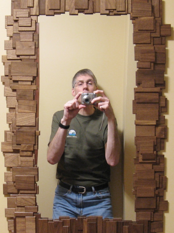 This one was made to fit in the 18-20" width we had available, with a 24" mirror height so that it was suitable for both myself (tall) and my spouse (/tall) to use. It consists of a basic rectangular frame with built-up layers of semi-randomly sized and spaced walnut tiles. An off-the shelf 12"-wide mirror cut to length was used for the functional portion of the mirror. There are a few construction details