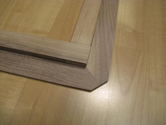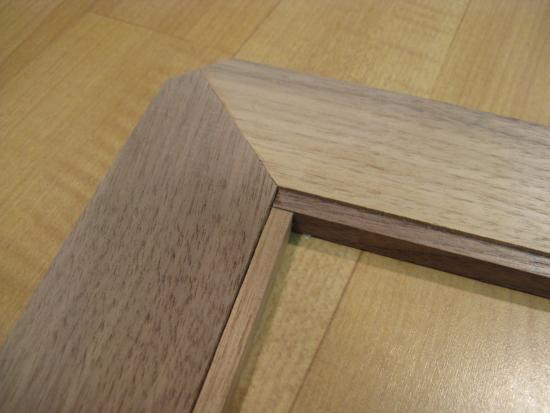 To the right is the frame with the tile support ledge added. The main frame was milled down on its outside edge from the bottom side so its height matched the thickness of two tiles, and then a thin support frame was attached. Below are close-ups showing how it went together.