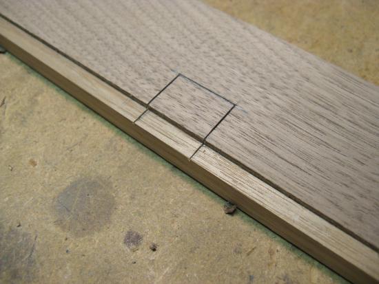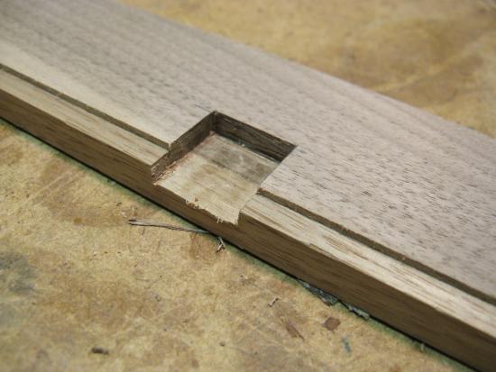 To hold the mirror in place, I opted for a thin piece (1/8" nominal) of foam-core as a backing with three cross-braces screwed to the frame. To avoid making the mirror assembly any thicker, I made cut-outs for the cross-braces. The shots below show one cut-out marked and then rather rudely chopped out with a chisel.