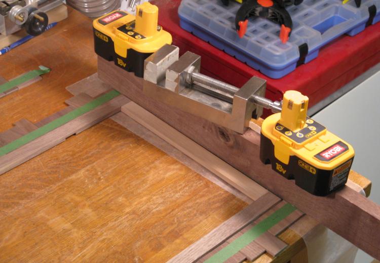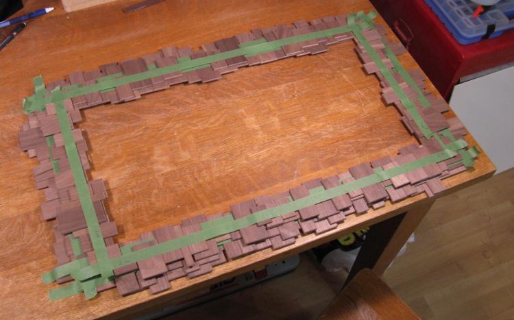 The frame was then assembled by gluing on rows of tiles, starting with the bottom row. This shows one of the short sides being glued (and just held down with some handy weighty objects rather than being clamped).