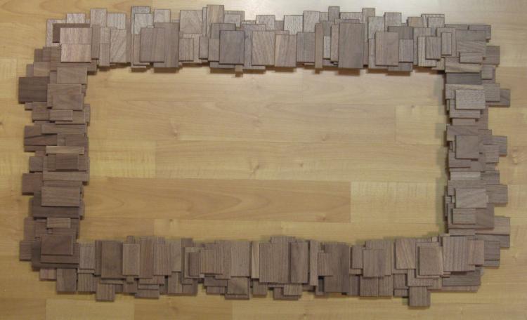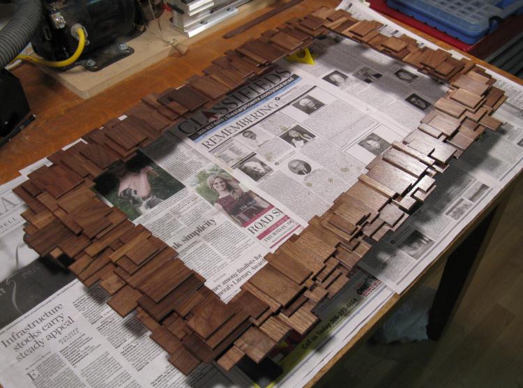 With a big stack of wood tiles, I started positioning them on the frame. I wanted one solid layer just on top of the frame to hold the mirror, and I decided to add a couple more layers below it and one or two on top.