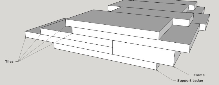 The lower layers of tiles are just butted against the frame here. Gluing them to the frame like that wouldn't provide adequate strength, so they needed a base. For everything to stack up correctly, this base would need to be exactly two tile thicknesses below the top of the frame.