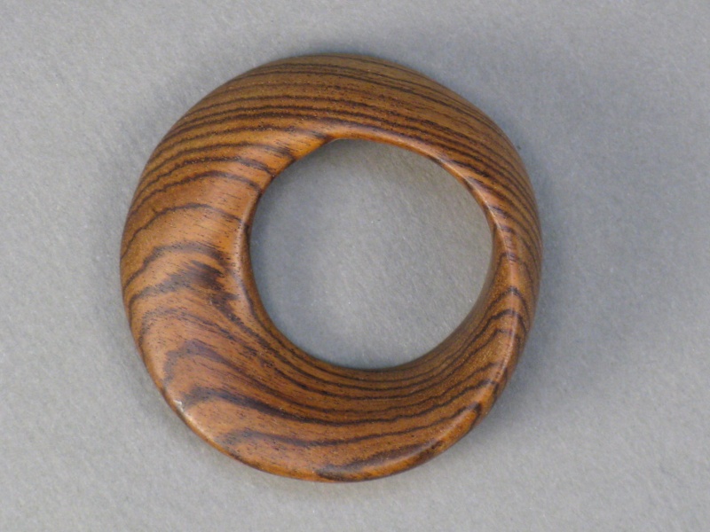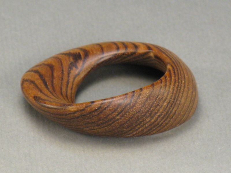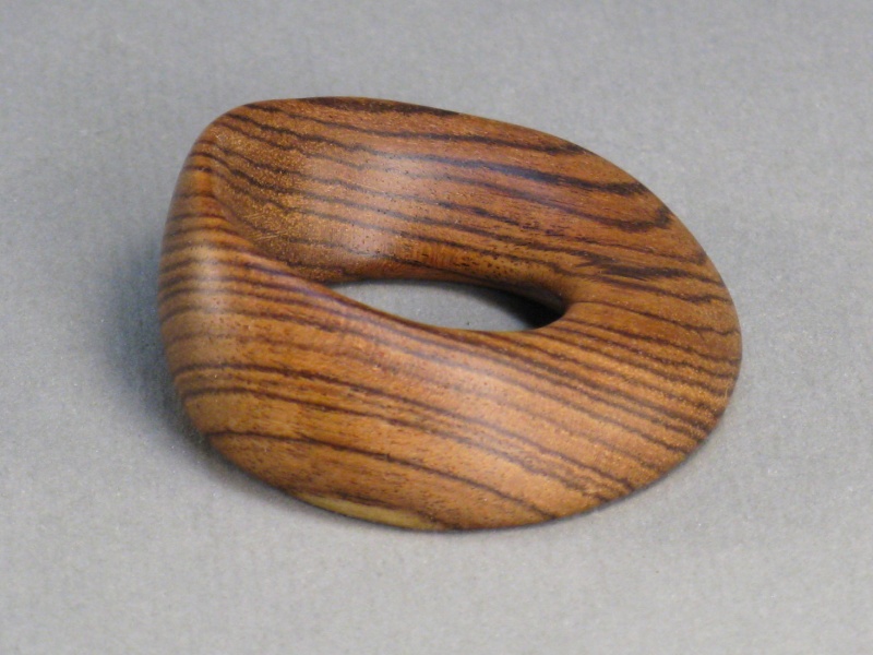 This is one of my favorite little pieces. It is a Mobius ring, which in concept is a one-sided strip. It is like what you get if you take a strip of paper, give a half-twist, and join the ends to form a ring. If you place a pencil on the surface and draw a line along the ring, you will come back to where you started the line. Unlike the Klein bottle, this one I could actually carve. I used Kingwood, which is a very hard wood. It also finishes very nicely when sanded with a fine grit. Like most of my little carvings, this one was just waxed.