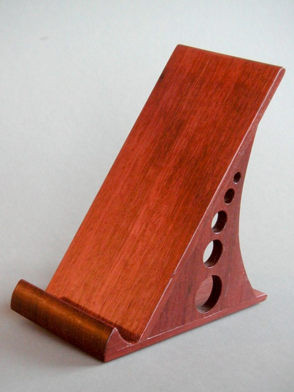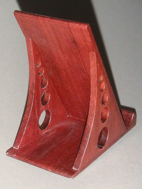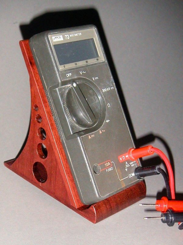 This is a stand I made to hold a multimeter for use at work. With small meters, you can either set them flat on the bench so you have to bend over to read them, or you can lean them against something where the smallest tug on the leads cause them to slide down and lay flat on the bench, where you have to bend over to read them. Our handyman of the time had built a number of holders out of old discarded plastic power-supply cases and MDF. While admirable for their innovative use of discarded material, they could not be accused of being attractive. So, lured by the practicality but repelled by the aesthetics, I decided to make this one up using Purpleheart. With some rubber feet on the bottom, it seems to work just as well as the plastic/MDF versions.