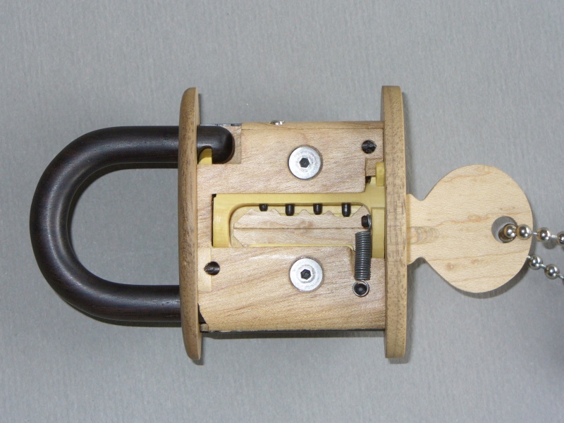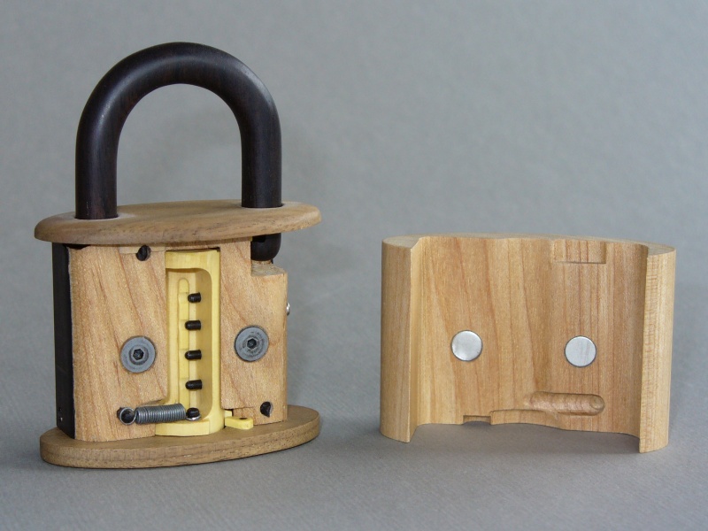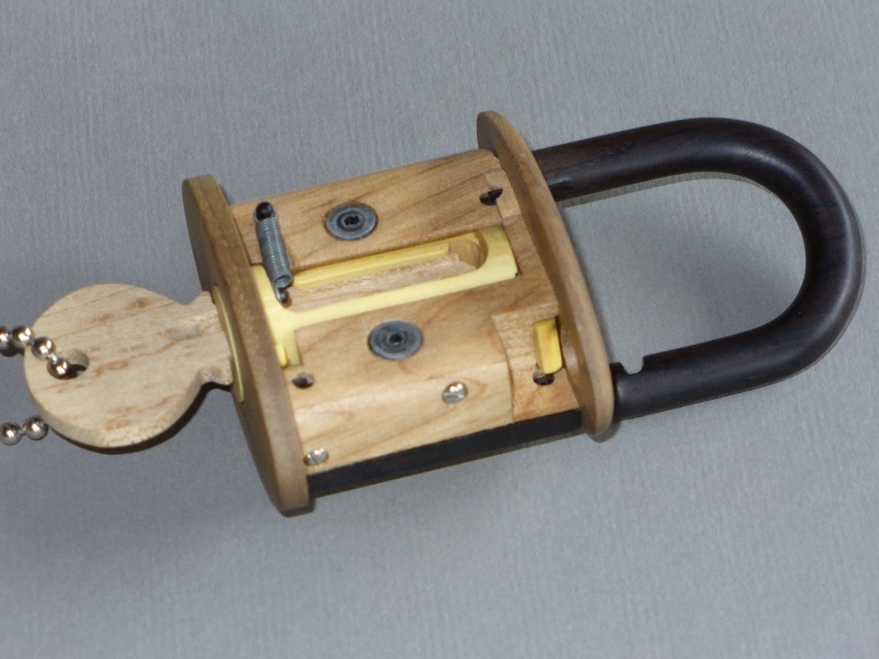 here). The removable side is held on using a couple of magnets mated to a pair of screw heads. The main section of the lock can also be disassembled by removing locking wedges that fit into slotted pins attached to the ends, since I wasn't sufficiently brave (foolhardy?) to just glue it all together when I thought I was done. There are around 44 pieces in the lock; all are wood except the springs, magnets, screws on the pin cover and the rather ugly-looking screw heads that mate with the magnets. Despite having serious concerns early on about friction preventing the key sliding past the pins, the lock works well. Just like your standard metal lock, unlocking it causes the hasp to spring up, and it then can be rotated. Closing the hasp causes it to lock into position again.