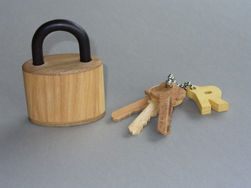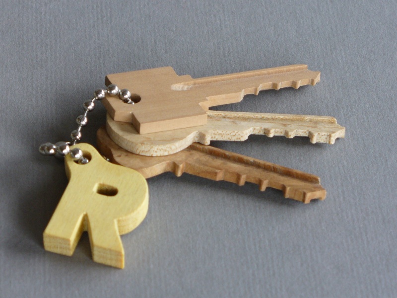 I had the urge to make a wooden mechanism, and decided to make a working 4-tumbler cylinder lock. The keys were the one of the first things I tried since I wasn't sure how practical they would be to make, however they worked out fine after a few practice tries. I gave the practice keys to the daughter of friends, who was a toddler at the time and fascinated with keys. I also fashioned an "M" for her initial as a key fob. So when I made the final keys for the lock, I made a matching "R" in the same "font" for my set of keys. By design, only the Bird's Eye Maple key works properly in the lock.