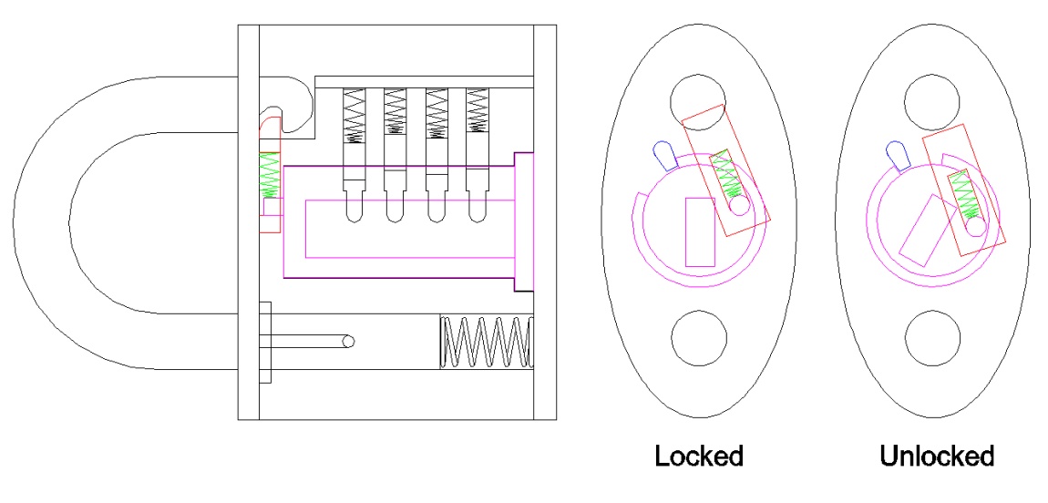 This diagram shows the operation of the latch (the red rectangle). In the "Locked" state it protrudes into a notch in the hasp (top black circle), preventing it from coming out. When the key is inserted and turned, the latch is pulled away and the hasp pops out as shown above for "Unlocked".