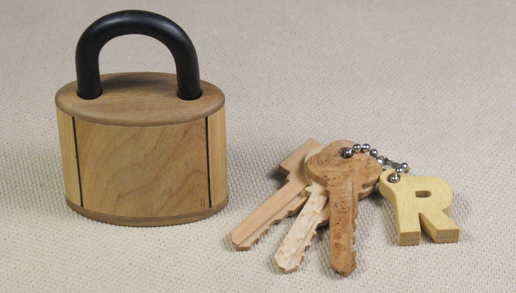 This shot shows the "back" of the padlock and the set of three keys. The center light-colored key is the Birdseye Maple one that opens the lock. The bottom key is made from Swiss Pear while the top one is Maple Burl.