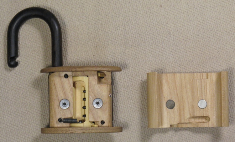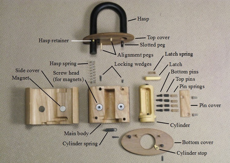 Also visible are the two lighter-colored toothpick-sized pegs (which were in fact made from toothpicks) that help align the cover with the body. You can also see the small yellow retaining pin for the hasp that limits how much it can travel.