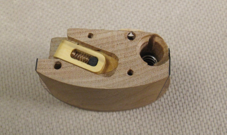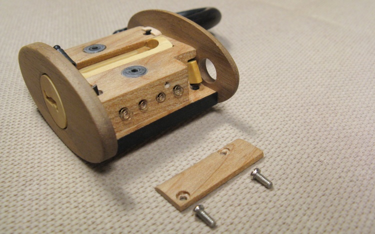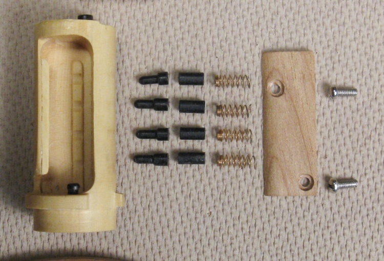 A small wooden plate is used to hold the lock pins and their springs in place. The small springs can be seen protruding a bit after the plate was removed.