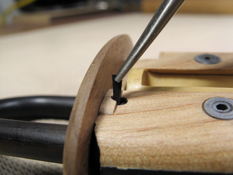 The top and bottom covers are held in place with slotted pegs. Hard African Blackwood wedges like the one shown here go through the slots to draw the covers in and hold them in place. There are two pegs each on the top and bottom covers.