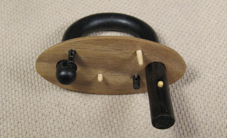 This is of course the critical bit, showing the yellow Boxwood cylinder and the African Blackwood pins. A close inspection shows that the length of the fatter sections of the bottom pins are different lengths, which define the keying for the lock.