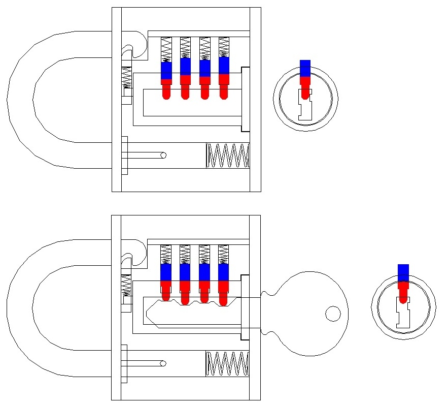 In this upper figure there is no key inserted, and the top pins (blue) are forced down by the springs and go into the holes in the cylinder to prevent it turning.