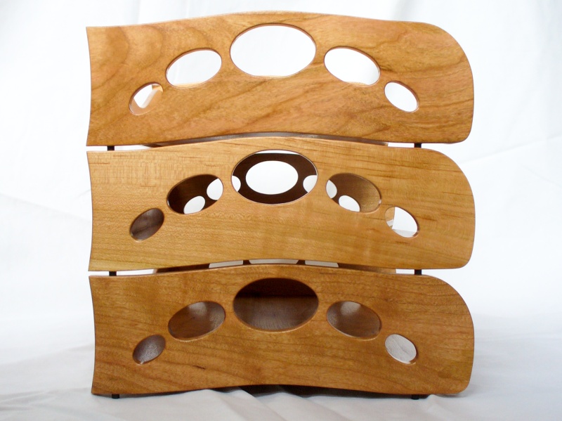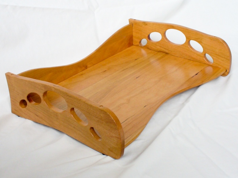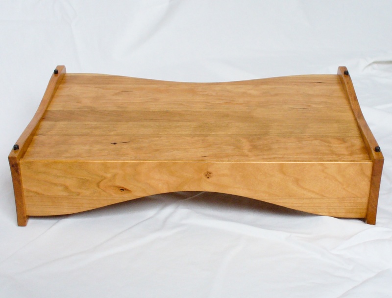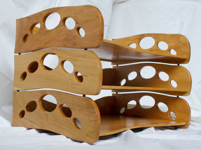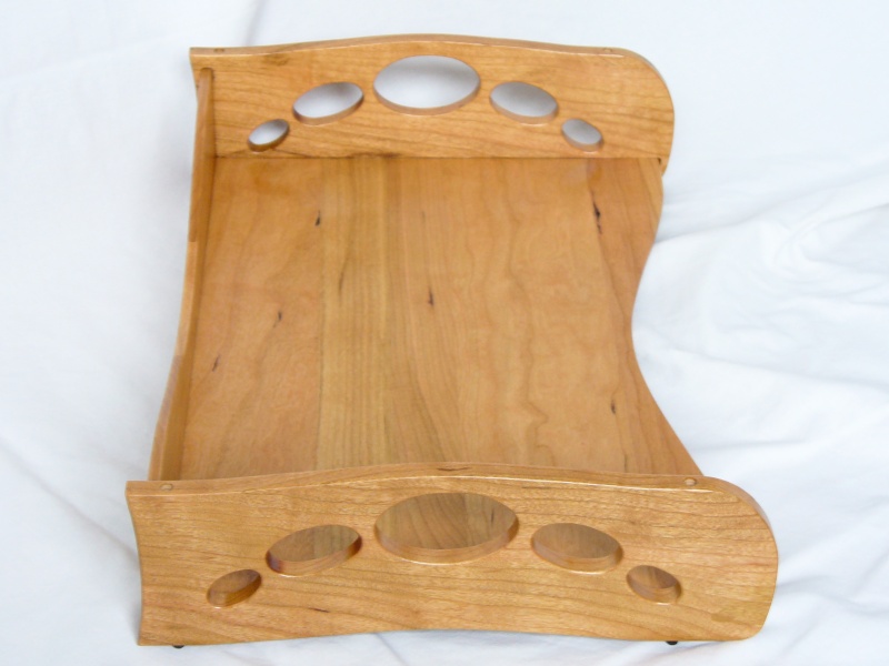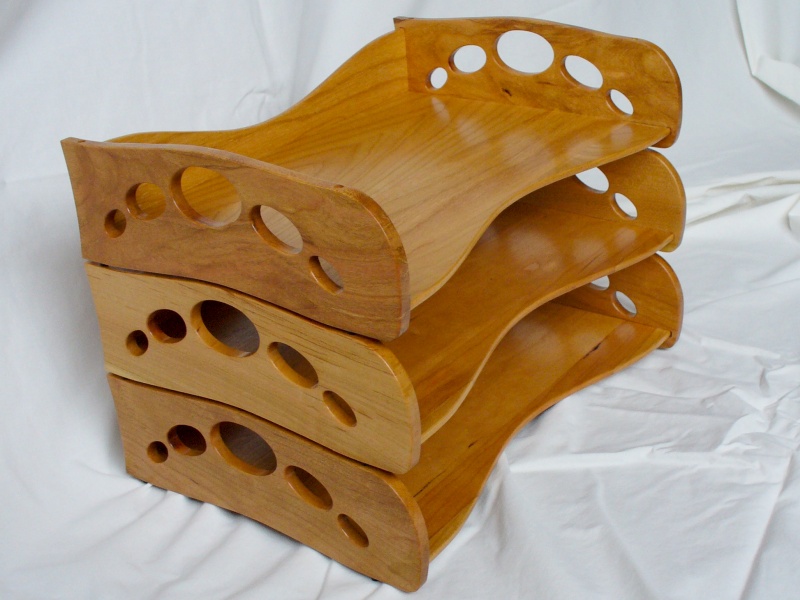 CFISIMI, I decided I needed to make some paper trays for my desk. I have a wooden desk (surprise!), although not actually made by myself, and my current yellow, beige and blue plastic trays just weren't the ideal complement to the Cherry desktop. At least my current trays, besides being cheesy and plastic, were actually a good size and style. However, I was unable to find many commercially-available trays in that configuration, much less ones that I thought looked nice. So after some fruitless searching, I decided to make my own. I made three identical trays that stack to hold my unsightly pile of papers. I used solid Cherry for the all the pieces except the feet. The feet are small African Blackwood pins that nest in holes in the tray below for stacking the trays together.