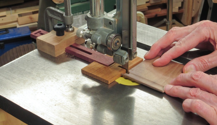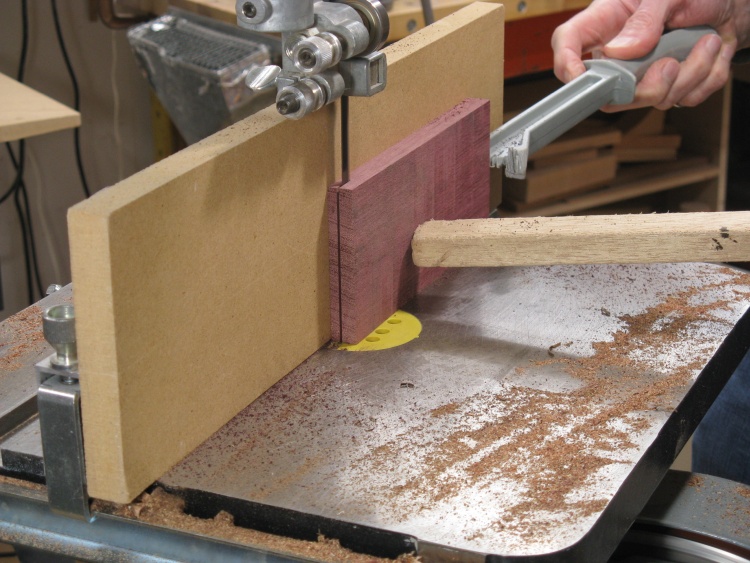 After doing some disappointing tests cutting to a specific depth with the bandsaw, I eventually made an adjustable stop to aid in the process, seen here clamped to the table.