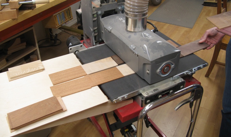 I used either the planer or drum sander to set the final thickness of the pieces but in this shot I'm feeding all the ones destined to be split into bases and props through the sander.