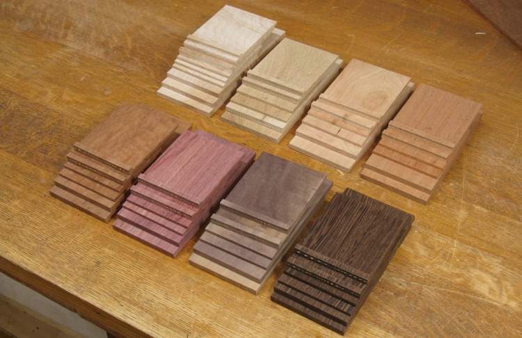 I eventually had a dozen different types of wood and in most cases made two stands each. The list included Birch Plywood, Cherry, Figured Maple, Mahogany, Maple, Red Oak, Purpleheart, Tigerwood, Walnut, Wenge, Yellowheart and Zebrawood. These were all woods that were lying around the shop in a large-enough size and quantity to make at least two stands.