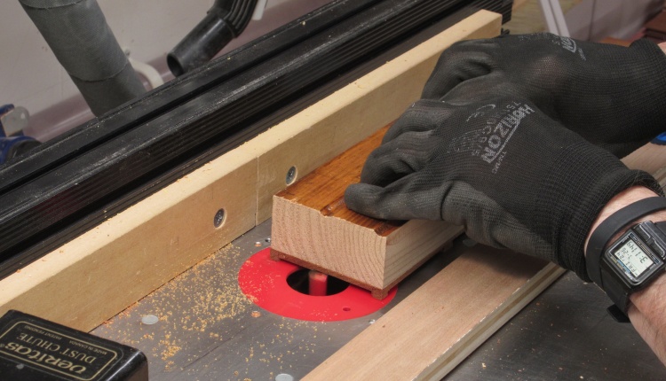 The double-thickness front of each of the bases was shaped into a phone-holding curve with multiple passed over the router bit, one of which is seen here.