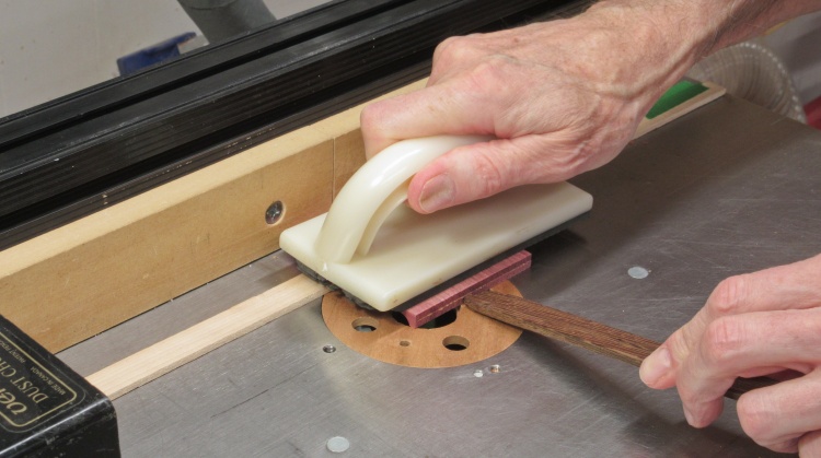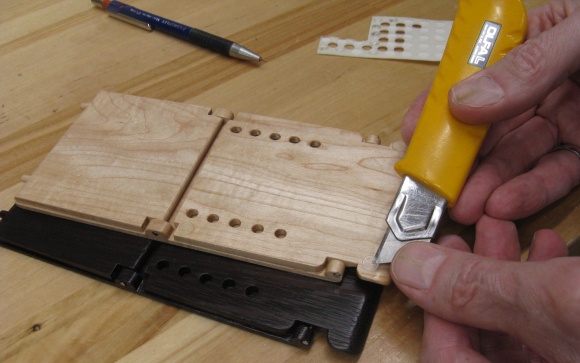 Here I'm using a small jig made from popsicle sticks to help align the hole position on the Yellowheart back.