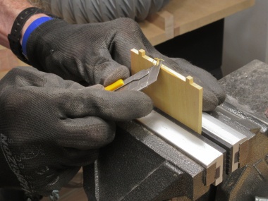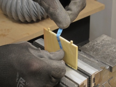 After the routing and sanding, the bases were further shaped by cutting a clearance for the lower hinge.