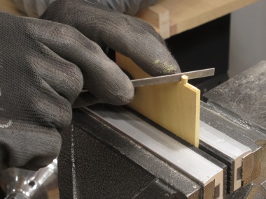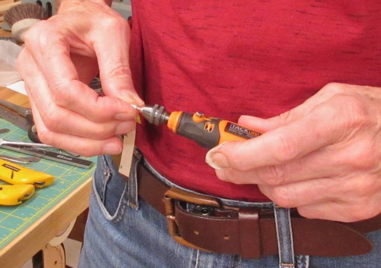 Being flat, the prop was the simplest of the three pieces that comprise the stand. It just needed some corner notches, rounded ends and the support pins. Below are a few shots of rounding the lower edge and the pins that engage with the holes in the base.