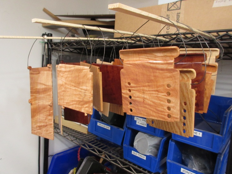 For handling, the pieces were given loops of stiff wire that fit into the hinge holes. As seen here the drying pieces were positioned close to the ceiling exhaust fan in the shop to more-efficiently remove varnish fumes.