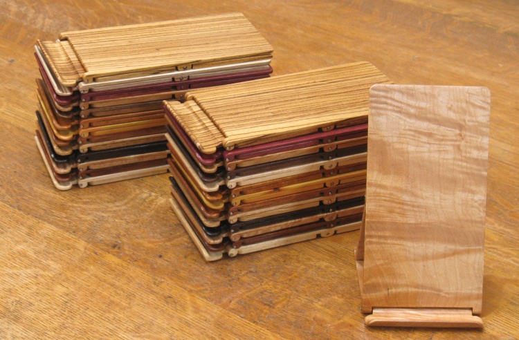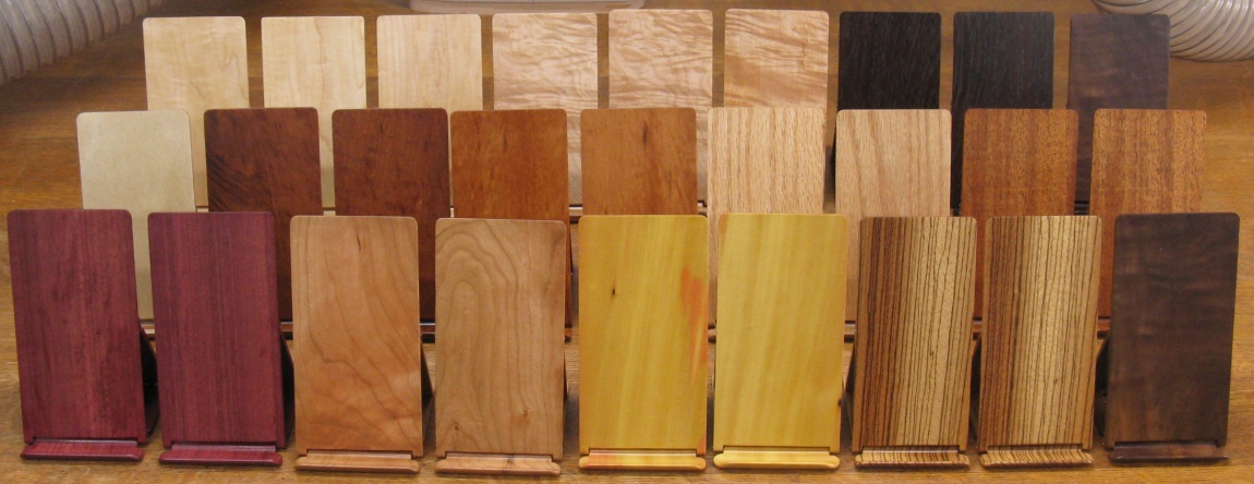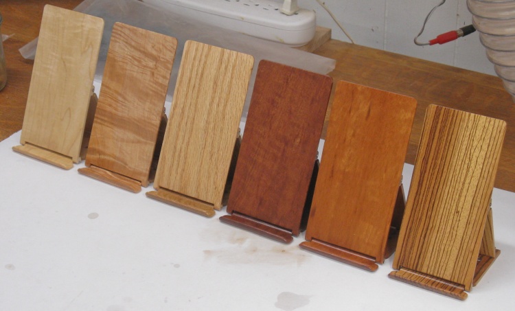I did the finishing in batches of six holders at a time, making sure they were all different woods. That made it easy to tell which base and prop went with which back.