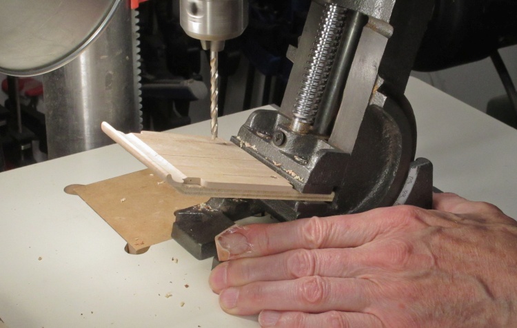Each pair of holes in the base were drilled at the appropriate angle to corespond to the angle of the prop. A variable-angle drill press vise helped with that operation.