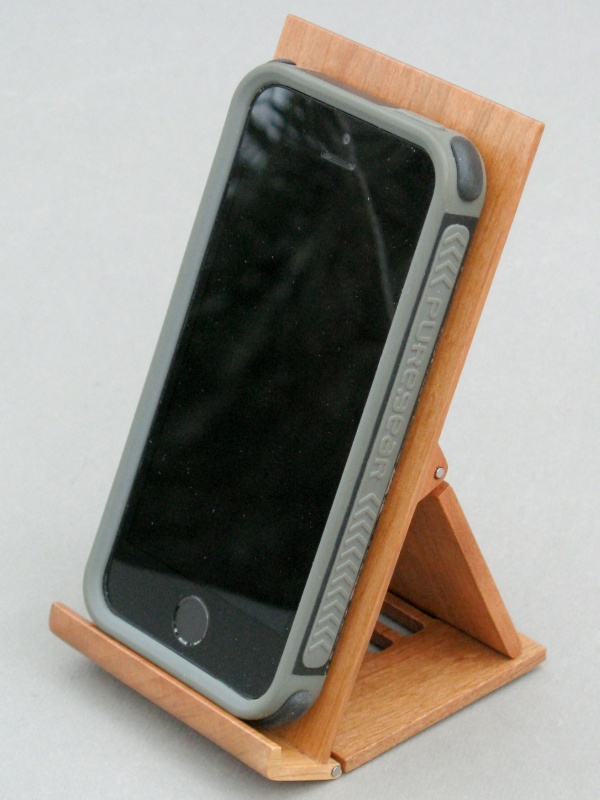 Sue sometimes used a metal cookbook stand to hold her phone vertically to make it easier to see the screen. This worked fine but the stand is a 6"-square piece of formed stainless-steel and is definitely overkill for a phone. I figured I could whip up a wooden version that was a bit more size-appropriate. The cookbook holder had a couple other shortcomings in that it is a fixed angle and also takes up a good chunk of real estate in its storage drawer. The stand would get around these issues by being adjustable for angle and would fold for more compact storage.