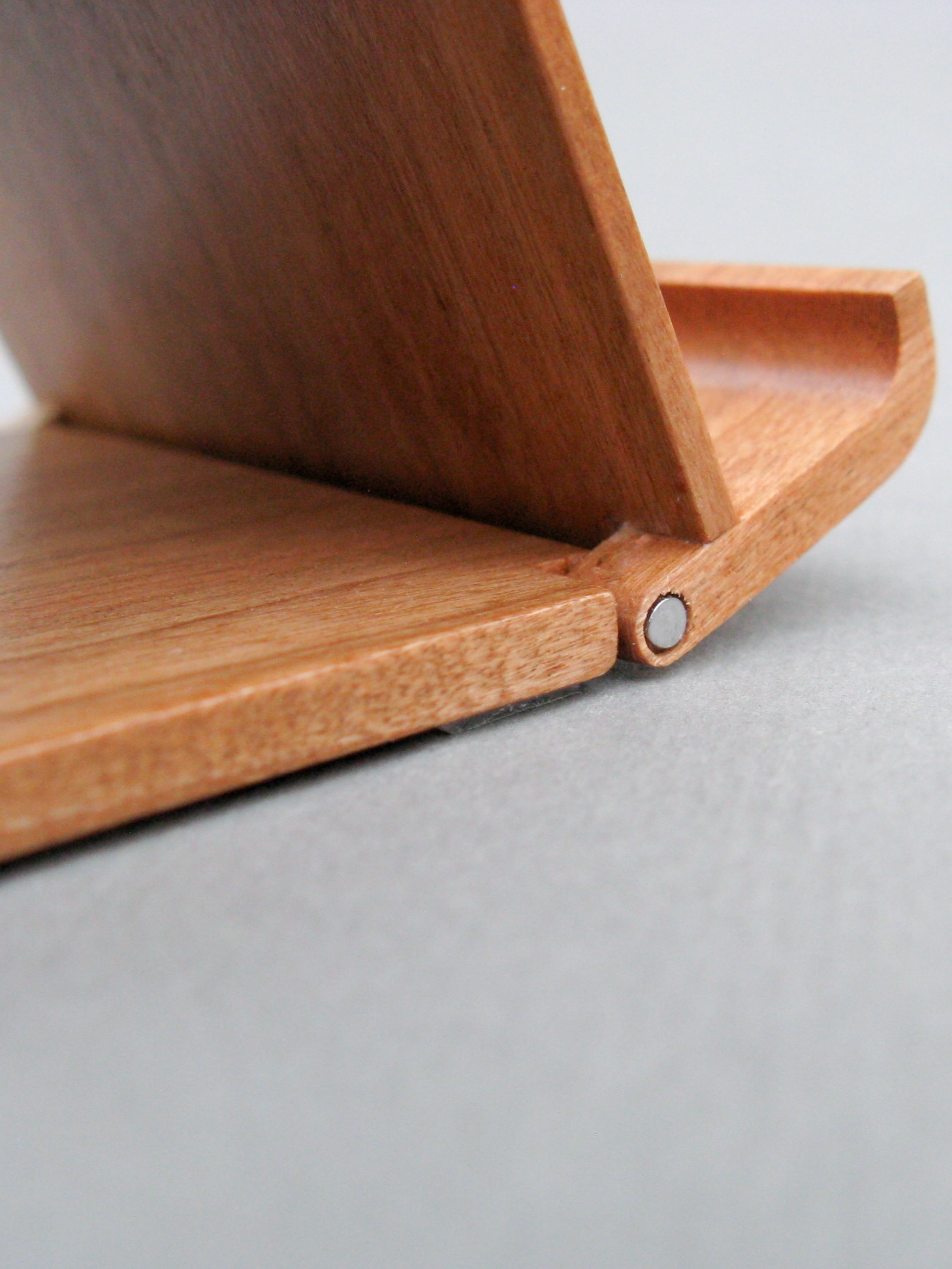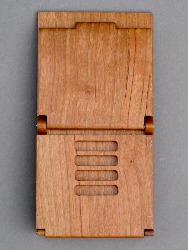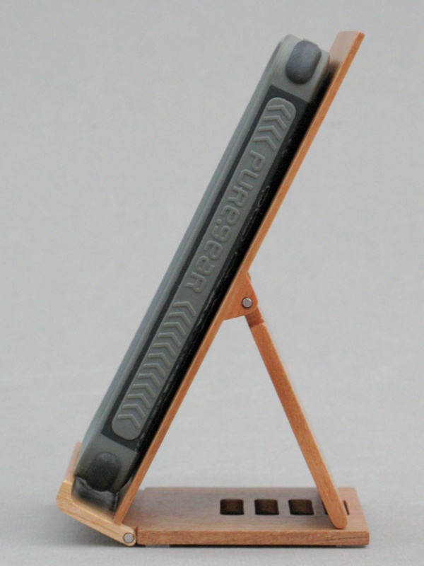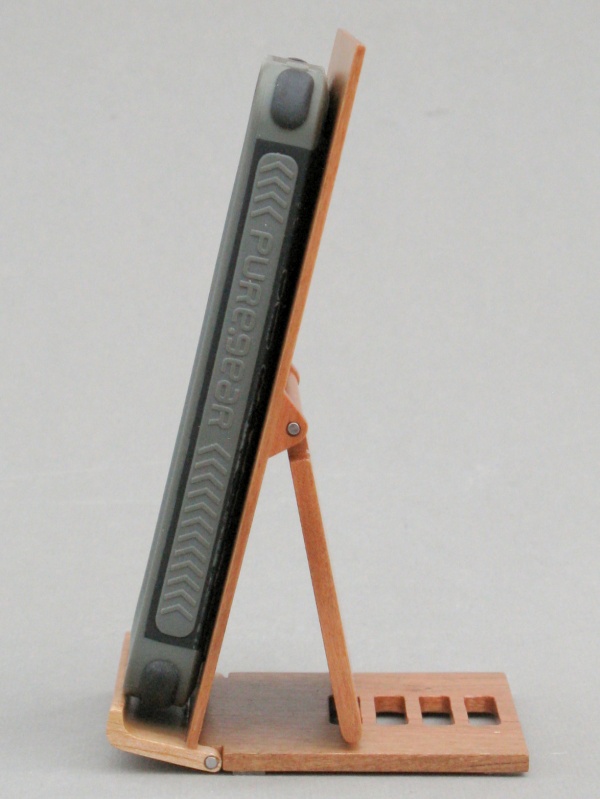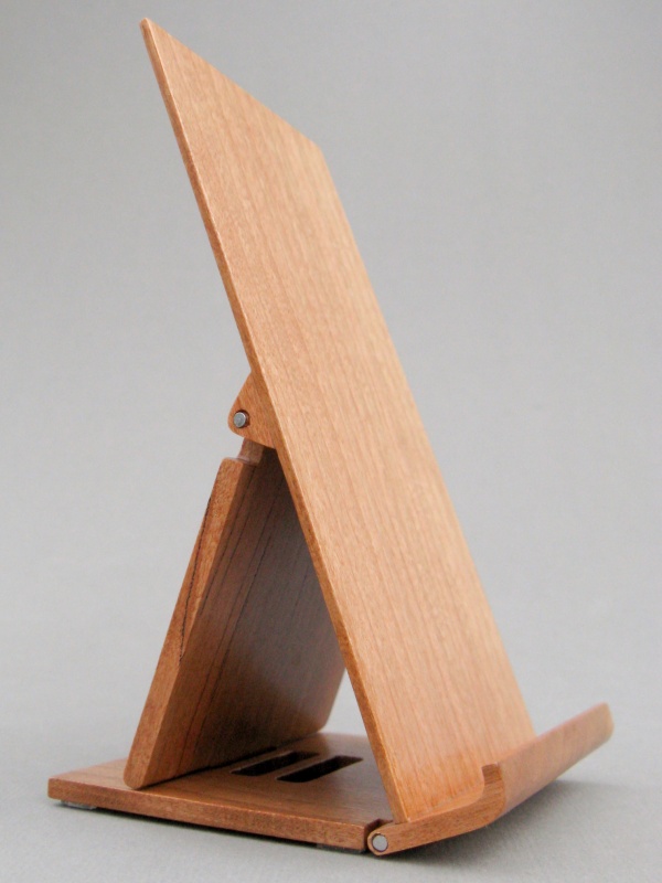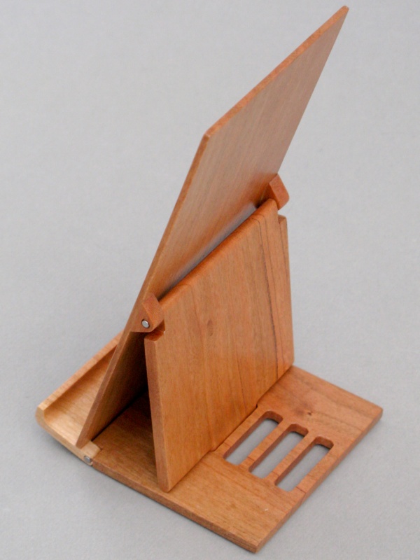 The stand is pretty straightforward in just being a flat backrest with a prop to set it to the desired angle. It consists of three thinnish pieces of cherry with a couple hinge points