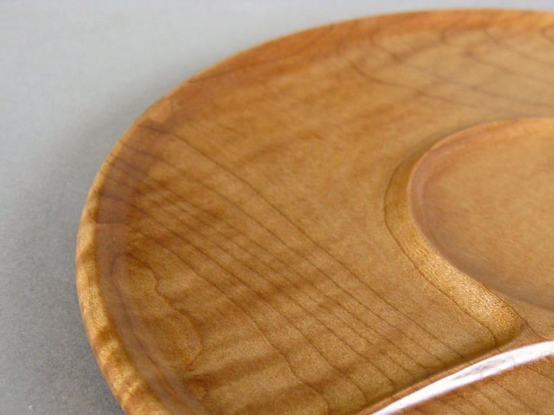 The obvious solution was a divided plate providing the requisite wet/dry isolation. I started with a plank of roasted curly maple with the basic shape being turned on the lathe and then the cavities were carved out. It is finished with a polyurethane varnish which I had previously tested to be adequately waterproof. There are a few construction details