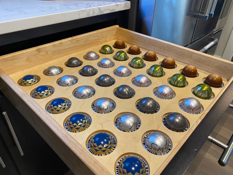 The design of the pod rack is pretty straightforward, with the pods sitting face-down in circular openings. It is made to fit the rather large Nespresso Virtuo pods which are about 2-1/4" in diameter. This line of pods is a bit different than most previous pod styles in that you can get different types of coffee in them (espresso, brewed, etc.) and actually come in three different depths to acommodate the quantity of coffee required for each type. The pods are colour-coded so you can tell what they are without needing to look at the top label. They also have a bar code on the bottom of the rim to tell the coffee brewer what type of pod it is (or the user of course, assuming they are fluent in bar code).