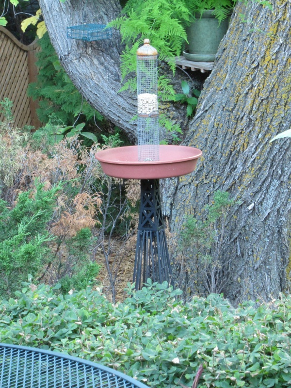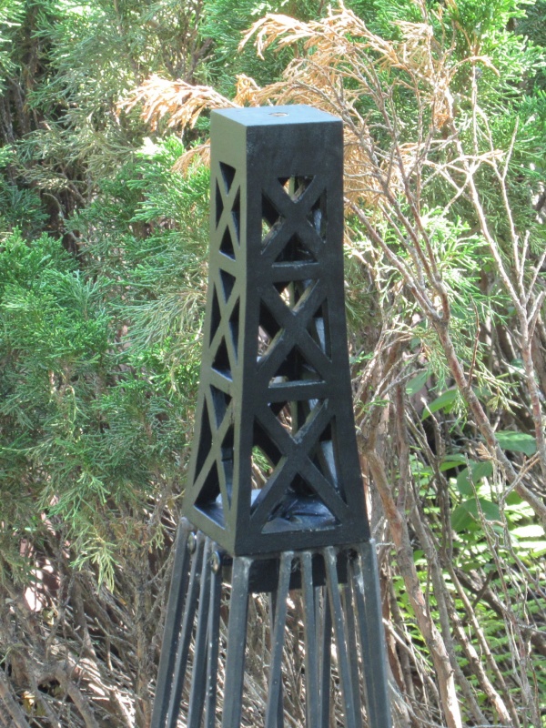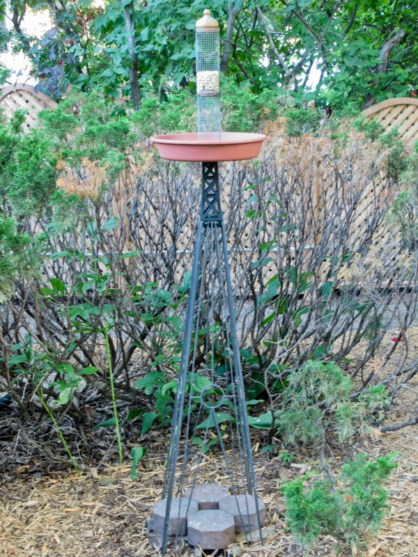 home-made job hand-crafted original that holds peanuts and is mounted on a metal garden obelisk. Over the years the surrounding vegetation has grown taller so it's becoming difficult to see the birds. I decided the feeder just needed to be raised eight inches or so and made this wooden riser to accomplish that.