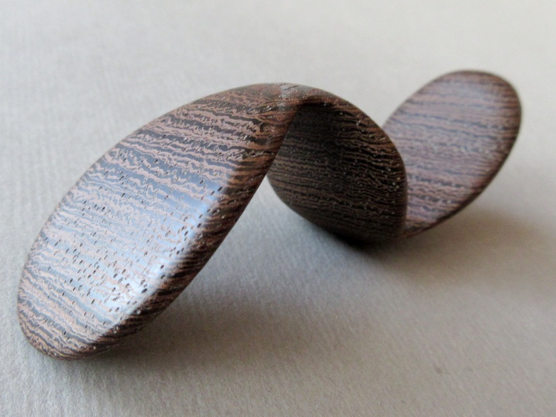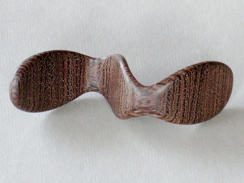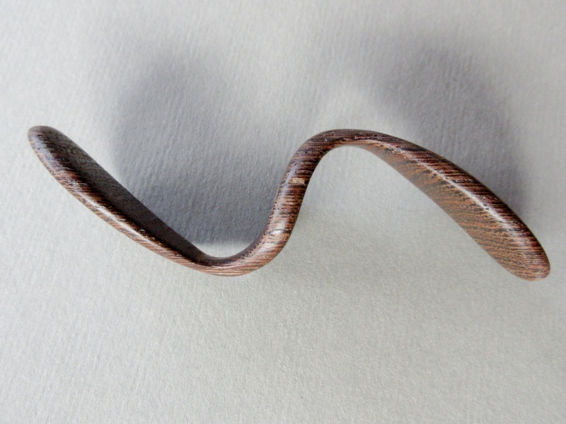 does. It is simply an "S" shape carved out of a cylindrical blank, so that the cross-section, or contact surface is circular. I used Wenge partially due to the strength so it would support the thinner sections of the wood. It also has a small grain pattern that works well with small pieces. As to how to pronounce Wenge, there seems to be some difference of opinion. Pronunciations vary from wane-gay, when-gay, wen-gay through vench. Personally, I'm a wen-gee (hard g like go) kind of guy.