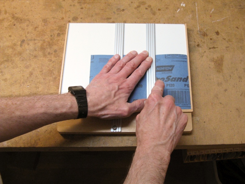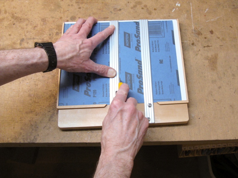 To use my cutting jig, a sheet is aligned to the left corner, the removable side holding two metal straightedges is set in place and a cut is made with a knife along the center straightedge to divide the sheet in half. Then the two sandpaper halves are stacked and aligned with the right corner, and cuts are made on both straightedges to divide that piece equally into three. Cutting time can be well under 30 seconds, freeing up much valuable loafing time.