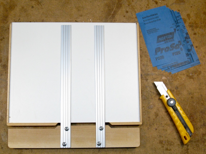 I used melamine as the base for the jig to give a smooth cutting surface while the glued-on walls form corners against which the paper is positioned. For the straightedges, I just used pieces from an aluminum channel I happened to have stashed in the rafters. The removable side has 45° slopes to mate with the jig edges to ensure proper positioning. This