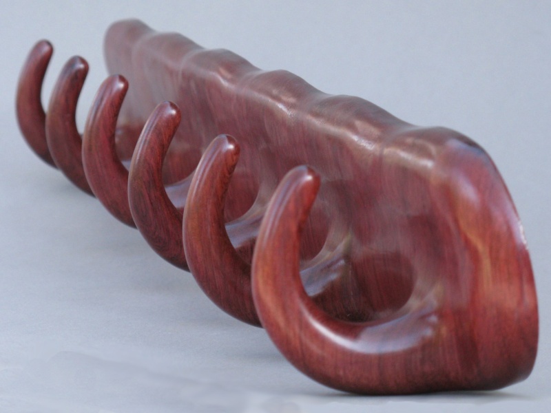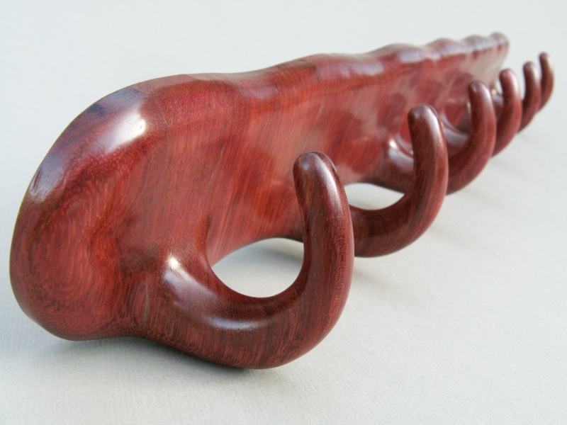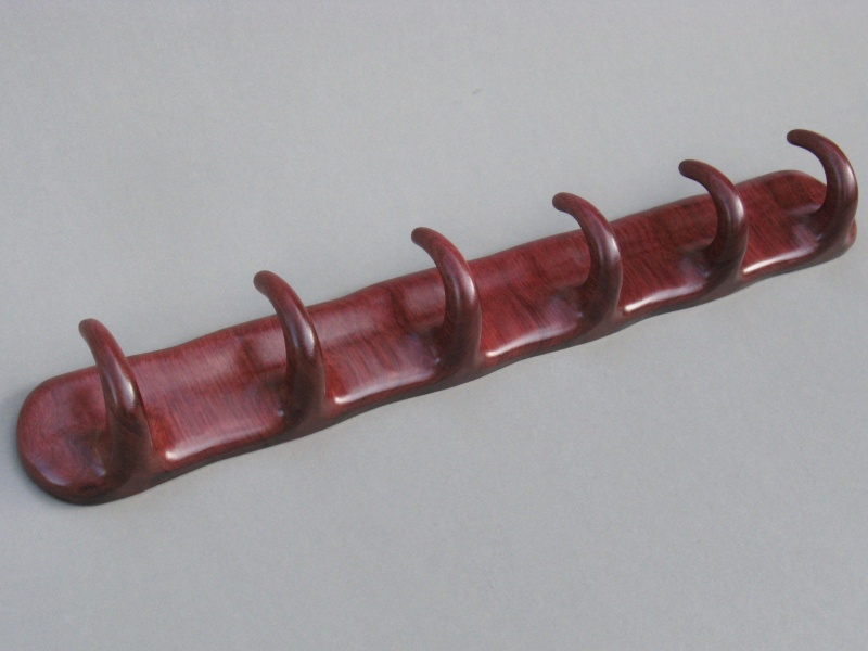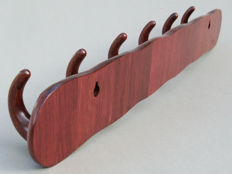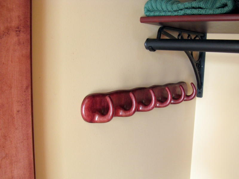 But back to the rack; to match the black/red color scheme of the closet I used Purpleheart for its dark red colour. The grain and surface appearance are also very attractive, and the wood is very strong and hard. The construction was pretty straightforward but involved a substantial amount of shaping, mostly done by power sanding and hand filing given the toughness of the wood. The rack was fabricated from six individual hooks laminated side-to-side with spacer pieces for a consistent vertical grain orientation. Some construction details can be seen