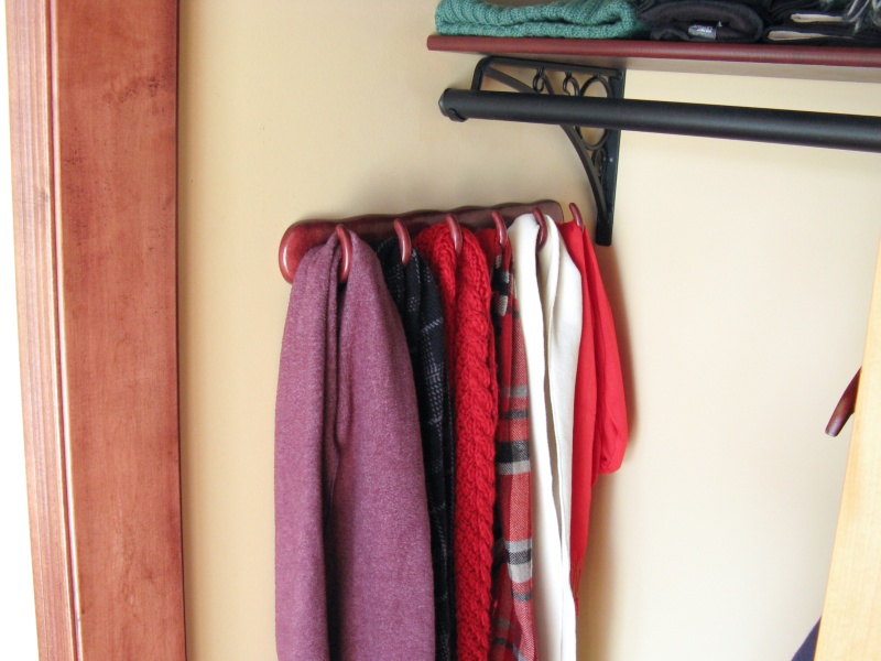We seem to have accumulated a number of scarves over the years, and in-season these are located in the front closet, some on hangers and some stuffed up on the shelf mostly out of reach. I made this rack to contain a few of them in a more-accessible location on the side of the closet. It has a half-dozen hooks of fairly generous size and doesn't take up much more closet space than another jacket would.