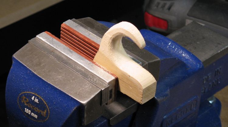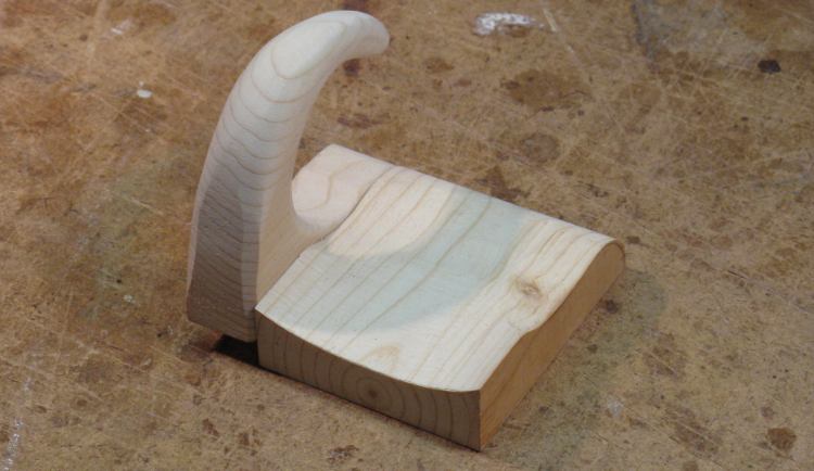 I used some nice soft wood that would be easy to work with (spruce, I'm guessing). This shot shows it in the middle of being shaped to round the hook portion.