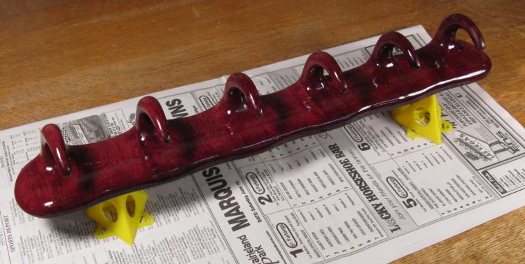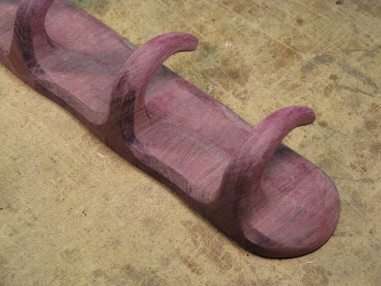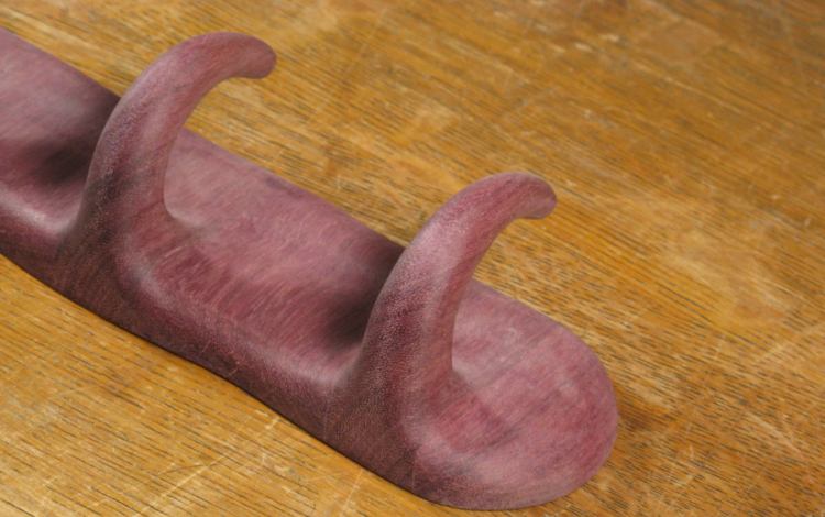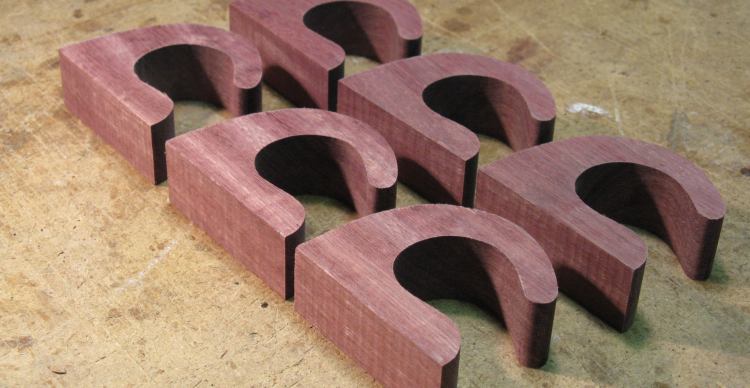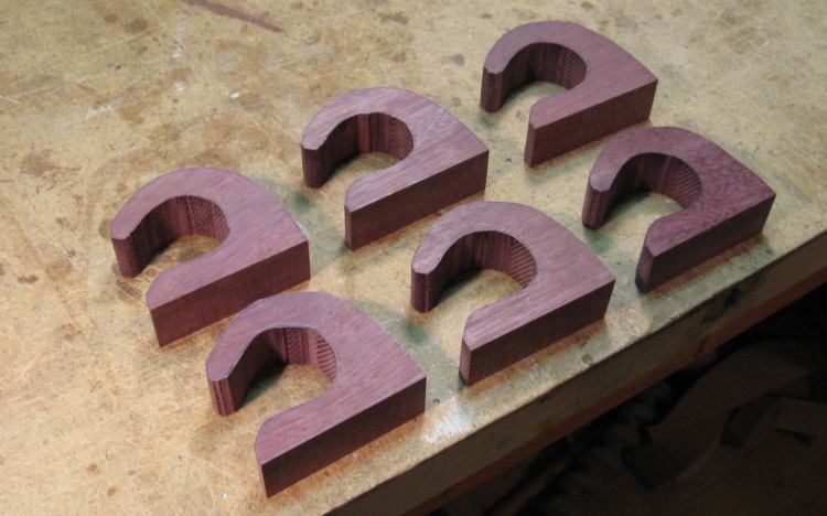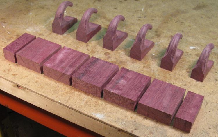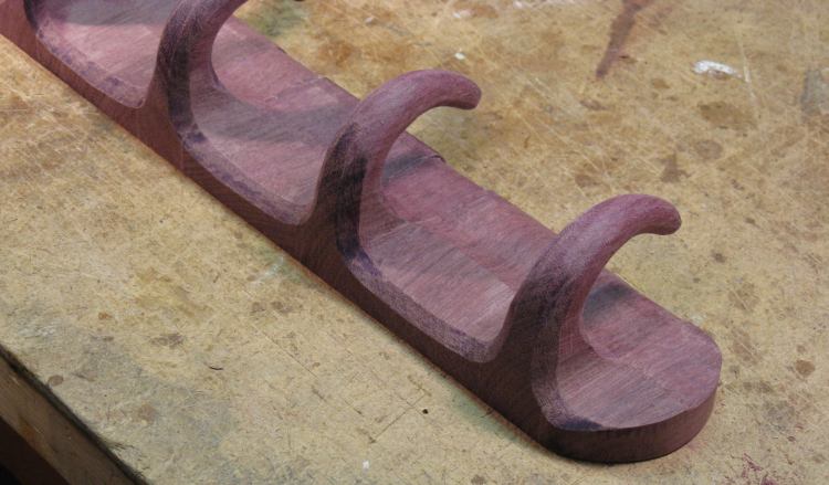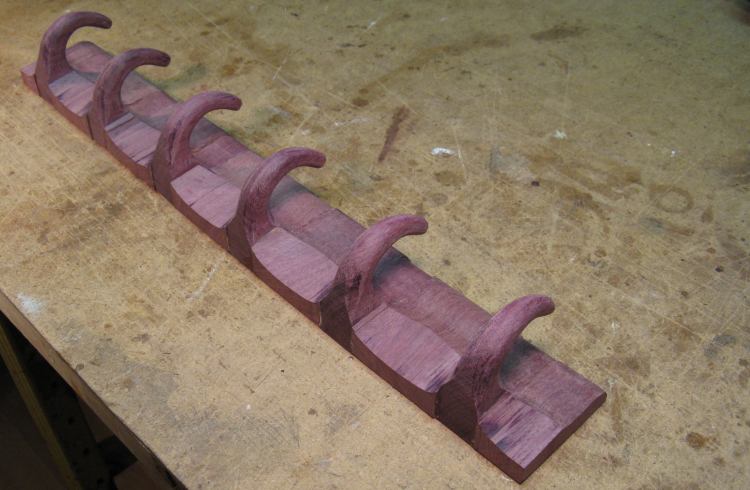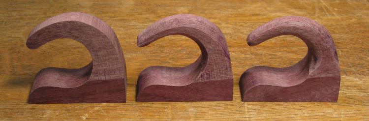 The next step was to make the spacers that go between the hooks. I wanted to try out the compound curves to make sure I was starting with the correct shape, so I made another softwood prototype, shown here attached to a hook. This looked OK, so I proceeded to making Purpleheart versions.