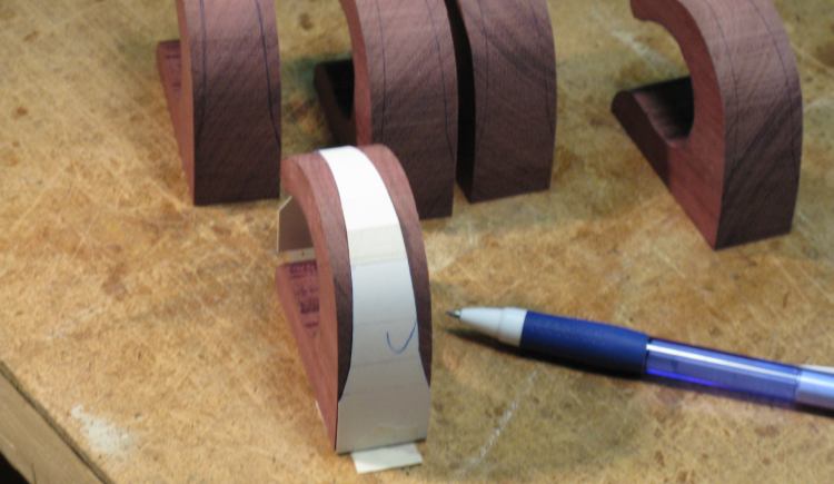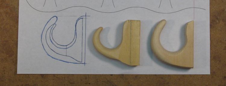 And here the hooks are looking a bit more dapper after having been sanded to the proper contour using a belt sander for the outside curves and a spindle sander for the insides.