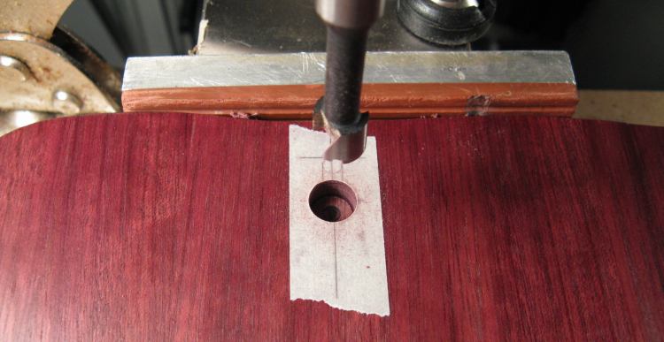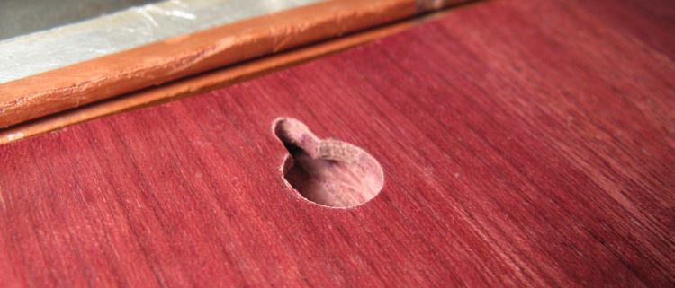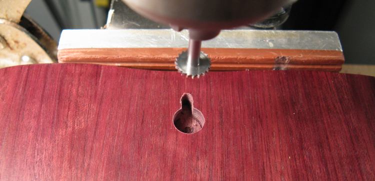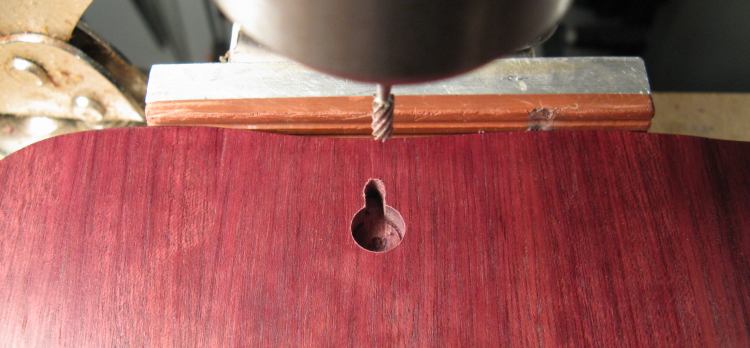 I didn't have a specialized keyhole bit so I used a three-stage procedure to cut the holes. First was a 3/8" diameter blind hole drilled with the forstner bit shown here.
