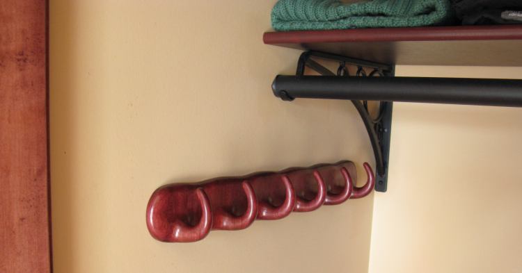 The design I used for the scarf rack was pretty straightforward, consisting of six wooden hooks in line. I had initially envisioned the backplate as a single piece with horizontal grain direction and the hooks as separate pieces with a vertical grain orientation for strength. However it seemed likely that the grain direction change might look odd, so I switched that over so that everything had a vertical grain orientation. This necessitated making a laminated construction since a twenty-inch-wide board would be rather tough to come by.