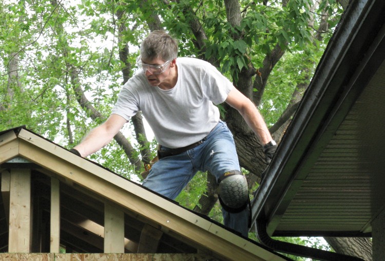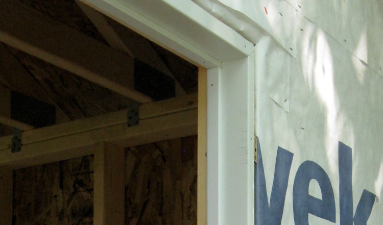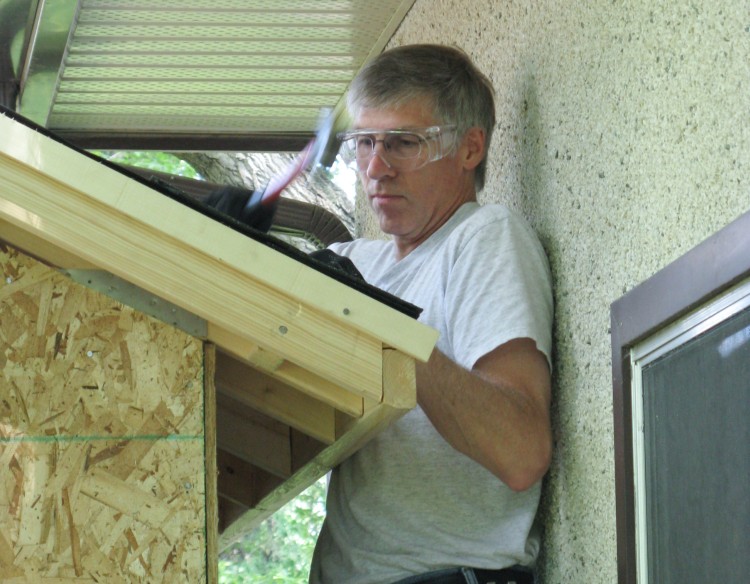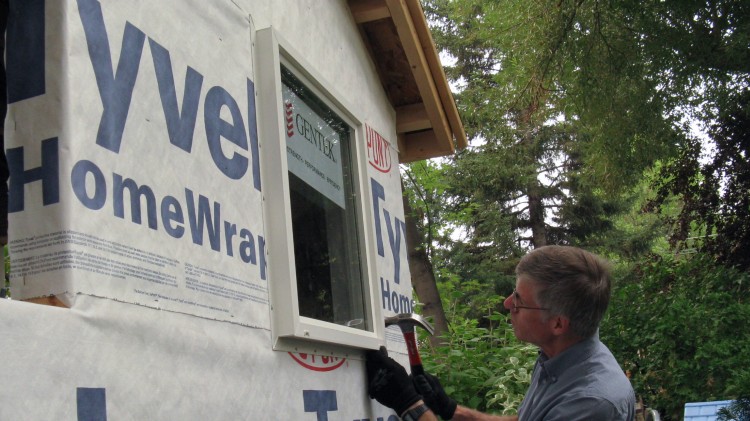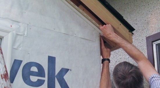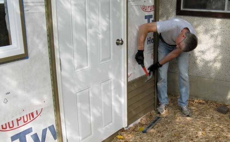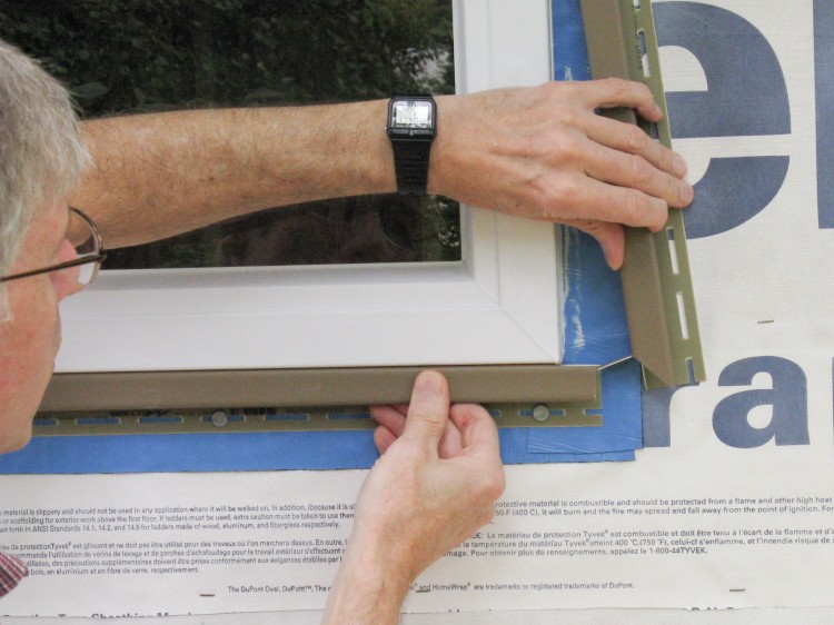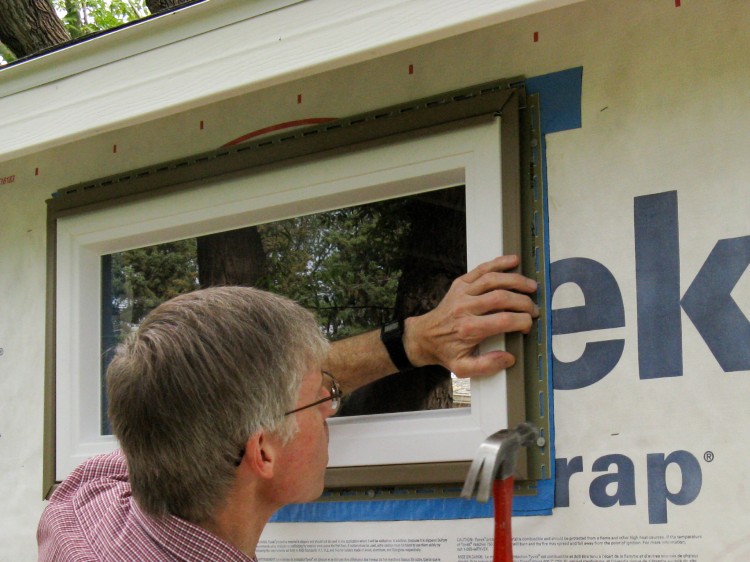 All building edges (of walls, roof, doors and windows) need a trim piece of an appropriate type added to accept the edges and ends of the siding. Here a J-channel is being nailed around one of the windows.