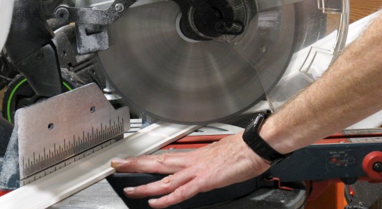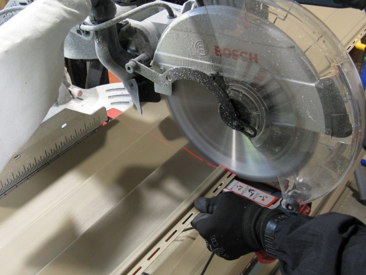 I was able to cut the siding using the mitre saw. As per recommendations, the blade was installed in reverse so the saw kind of wore its way through rather than actually cutting, but it still made a nice smooth edge. This saw has a laser indicating the location of the cut, which was very handy.