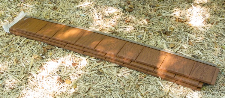 The siding covered only the lower walls, with the gables left to be covered by a different material. I had chosen a vinyl "cedar shake" which came in panels as shown here.