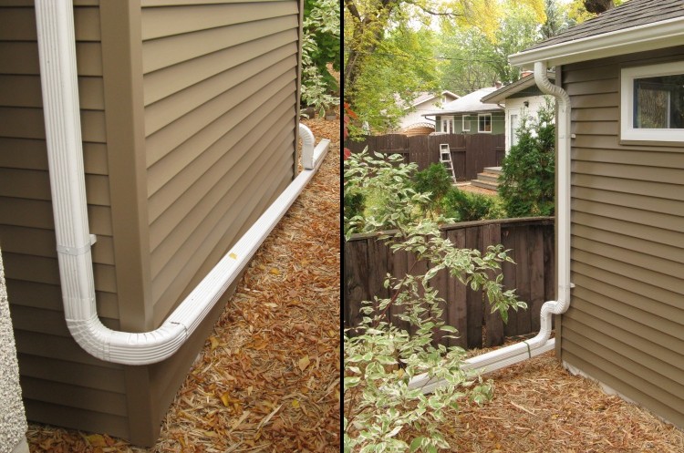 Downspouts were run from each side of the shed to empty out a bit further back in the yard. The garage roof eaves trough was also modified to dump into the near-side trough of the shed to reduce the number of drainpipes needed.