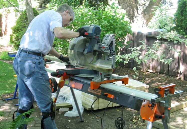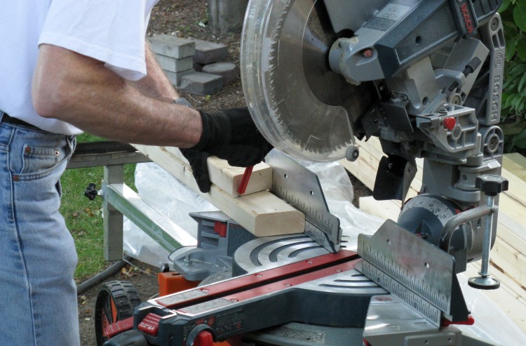 For cutting the 2x4s, I used a nice Bosch Dual-Bevel Sliding Mitre saw lent to me by a buddy of mine who obviously has excellent taste in tools. He also provided the tool stand which was very handy for wood support.